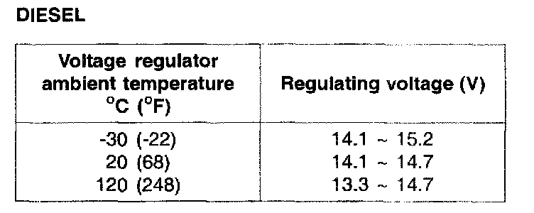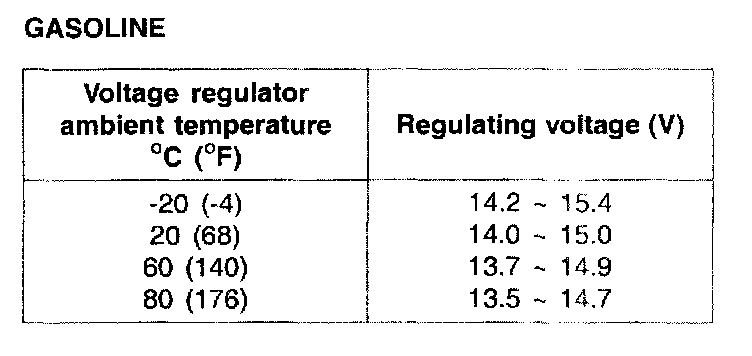 1. If the voltmeter reading agrees with the value listed in the Regulating Voltage Table, the voltage regulator is functioning correctly. If the reading is other than the standard value, the voltage regulator or the alternator is faulty.
