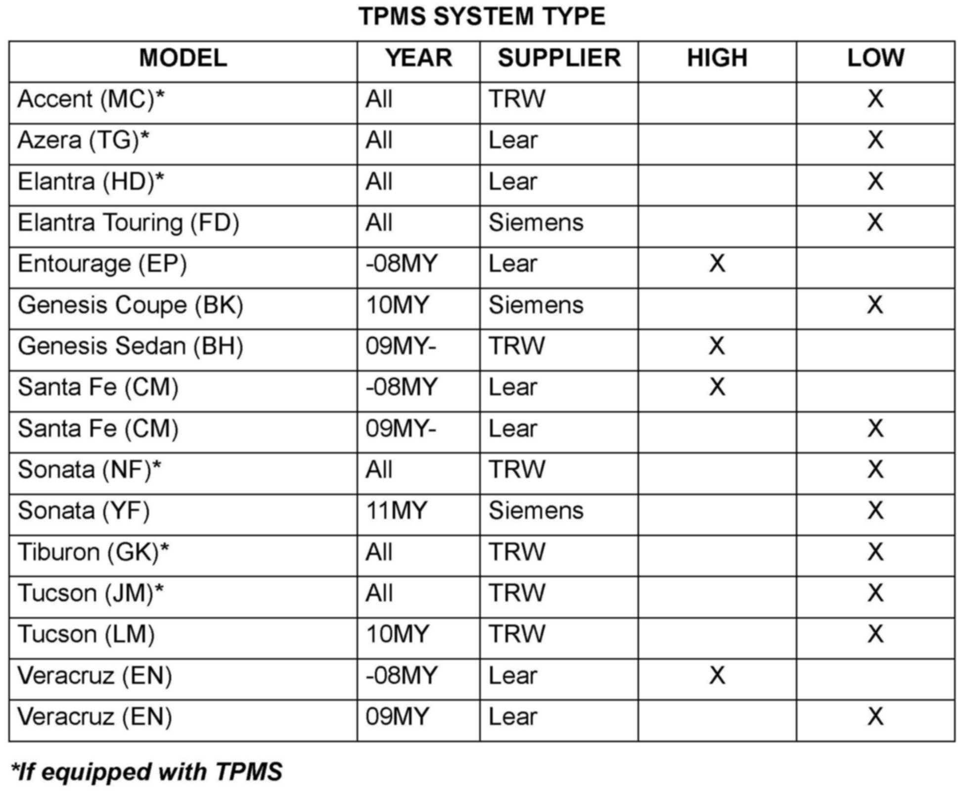 Hyundai uses three suppliers for the TPMS systems across the vehicle line-up, TRW, Lear, and Siemens. Each of these systems operate in a very similar manner, but have some minor variations in operation as described in this TSB.