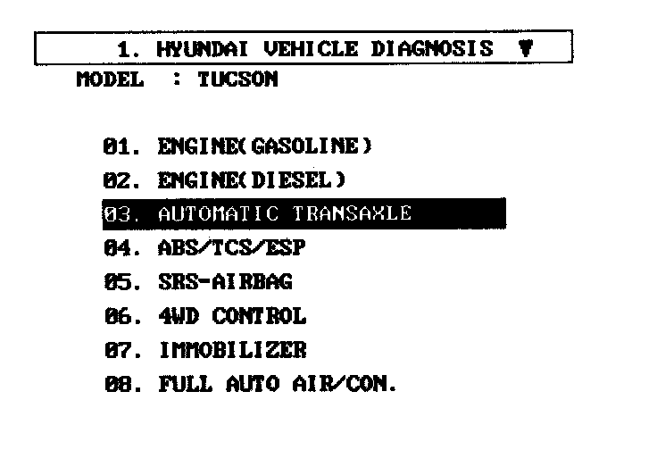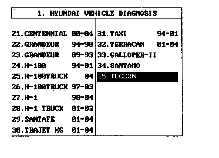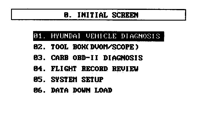 Having connected and turned on scan tool, the vehicle and system selection must be made from the 1.0 HYUNDAI VEHICLE DIAGNOSIS SCREEN.