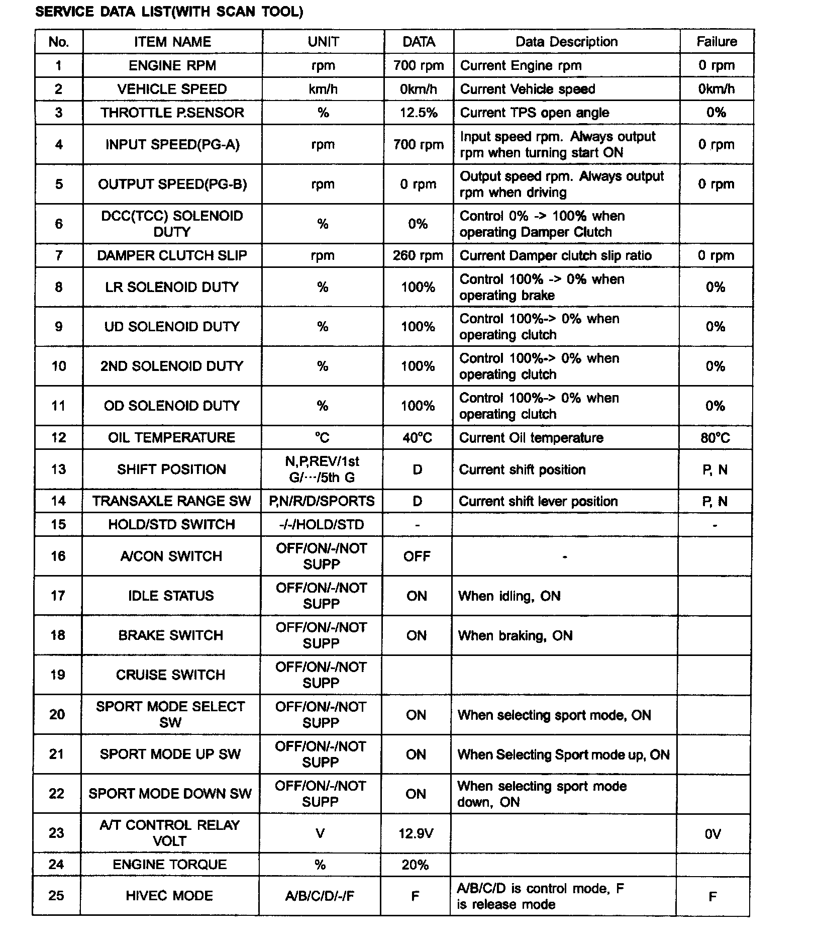 SERVICE DATA LIST (WITH SCAN TOOL)