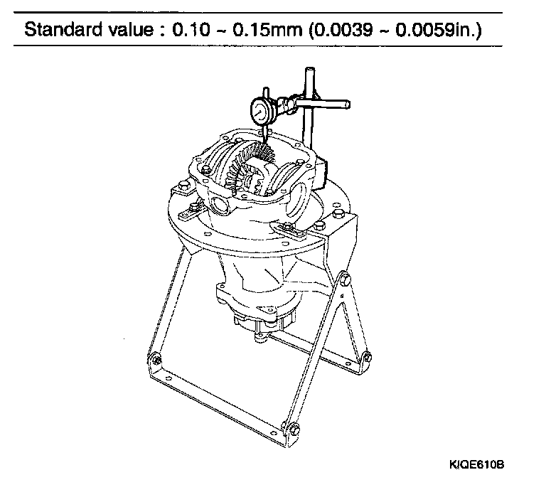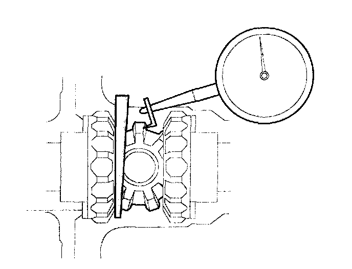 a. Fix the side gear with a wedge so it cannot move and measure the differential gear backlash with a dial indicator on the pinion gear.