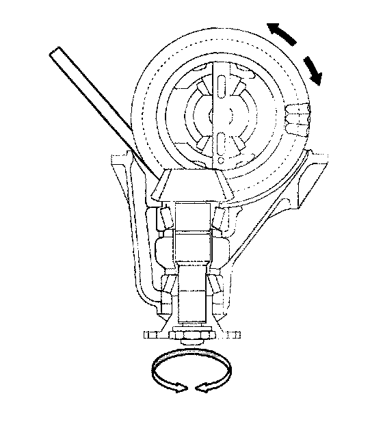 b. Insert a brass rod between the differential carrier and the differential case, and then rotate the drive gear by hand (once in the normal direction, and then once in the reverse direction) while applying a load to the drive gear so that some torque (approximately 25-30 Nm) is applied to the drive pinion.