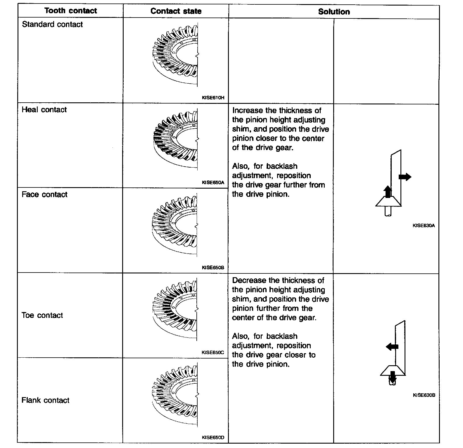 NOTE: Tooth contact pattern is a method for judging the result of the adjustment of drive pinion height and final drive gear backlash. The adjustment of drive pinion height and final drive gear backlash should be repeated until the tooth contact patterns are similar to the standard tooth contact pattern. When you cannot obtain a correct pattern, the drive gear and drive pinion have exceeded their limits. Both gears should be replaced as a set.