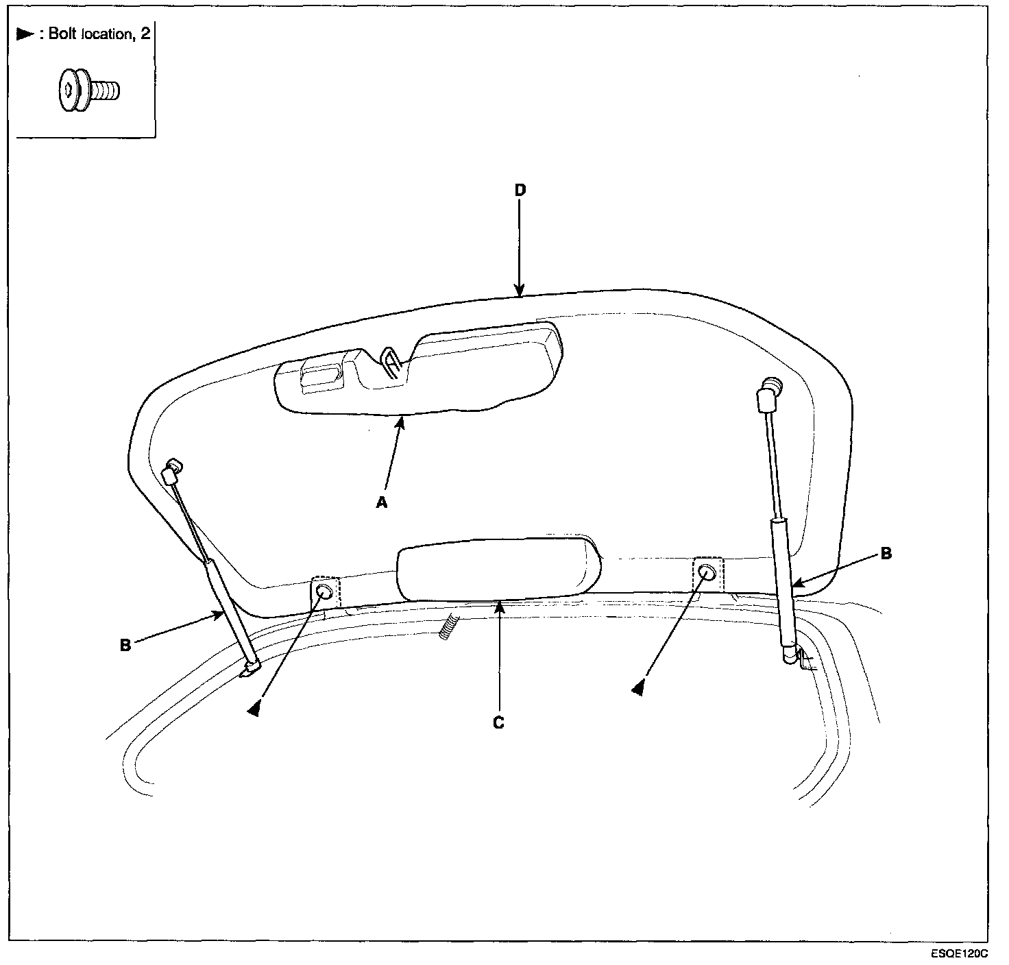 2. After loosening the mounting bolts remove the tailgate glass (D).