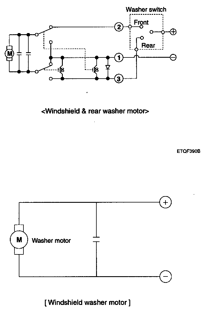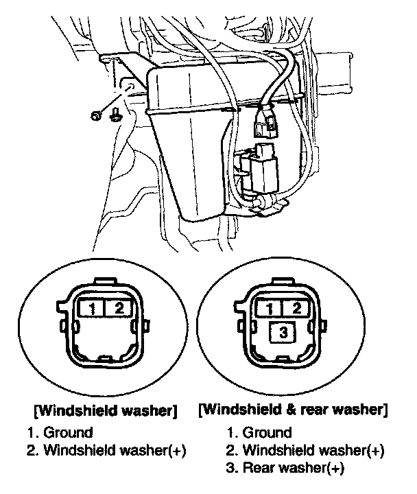 2. Connect positive (+) and negative (-) battery cables to terminals 2 and 1 respectively to see that the washer motor runs and water sprays from the front nozzles.