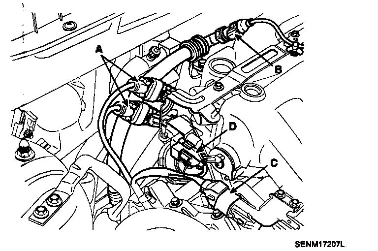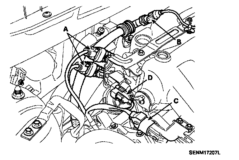 3. Disconnect the RH front and rear oxygen sensor connectors (A), the power steering sensor connector (B), the RH injector harness connector (C) and the VIS solenoid valve connector (D).