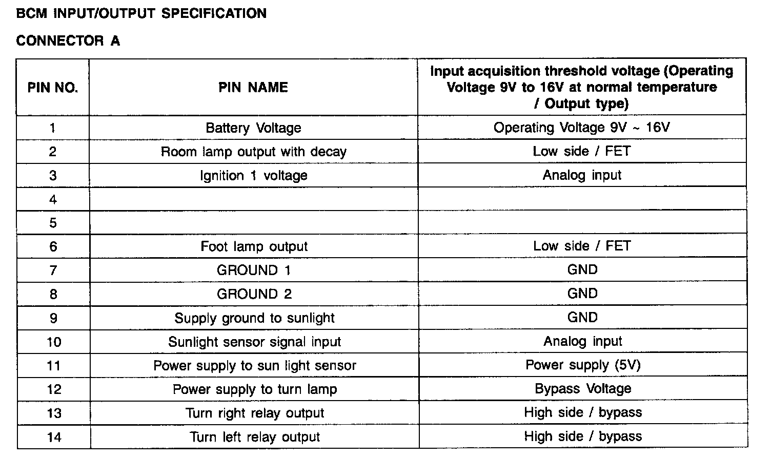 BCM Input/Output Specification:
