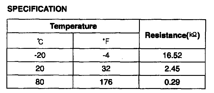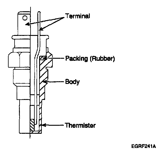 4. After immersing the thermistor of the sensor into water (or engine coolant), measure resistance between OTS terminals 1 and 2.