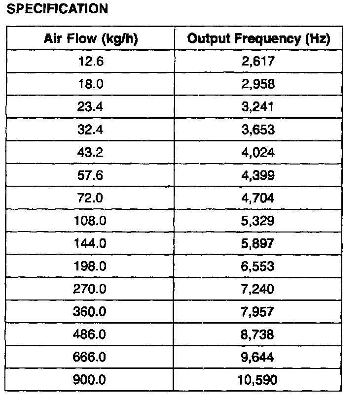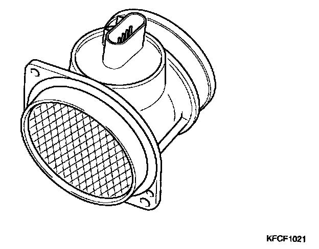 Mass Air Flow Sensor (MAFS) is a hot-film type sensor and is located in between the air cleaner and the throttle body. It consists of a tube, a sensor assembly and honey cell and detects intake air quantity flowing into the intake manifold. While the intake air coming out of the air cleaner flows by the honey cell, it becomes laminar flow, and then it passes the hot-film. At this time, heat transfer is generated by convection and this sensor loses its energy. This sensor detects the mass air flow by using the energy loss and transfers the information to the PCM by frequency. The PCM calculates fuel quantity and ignition timing.