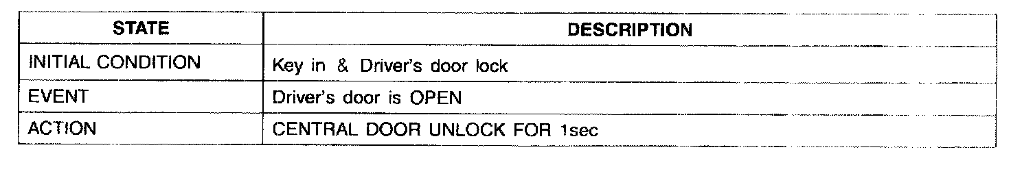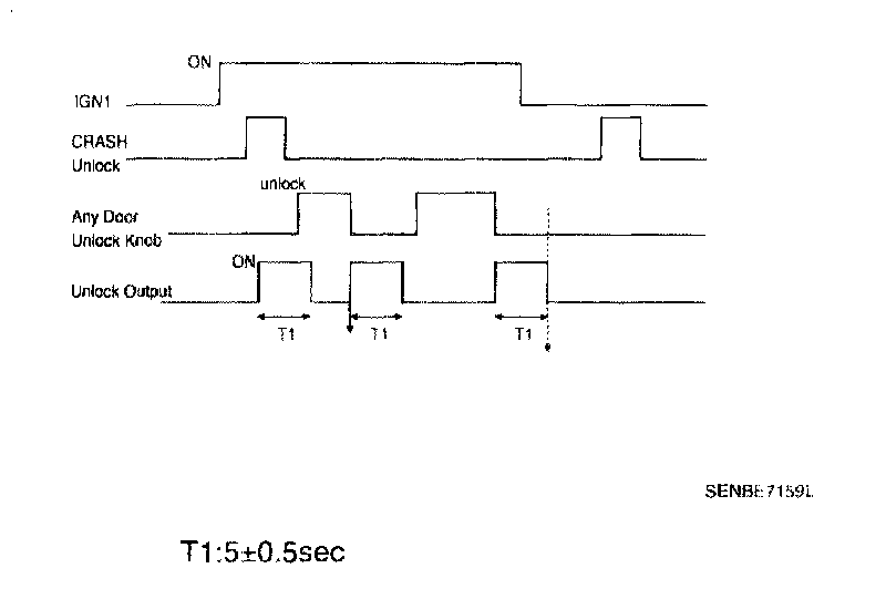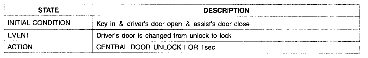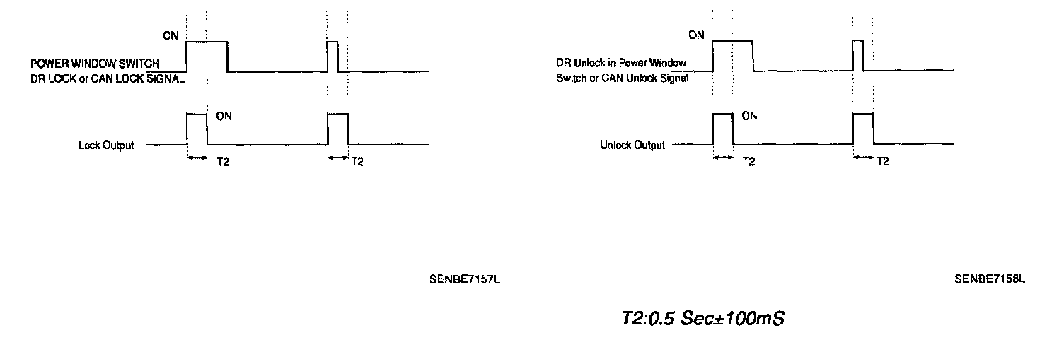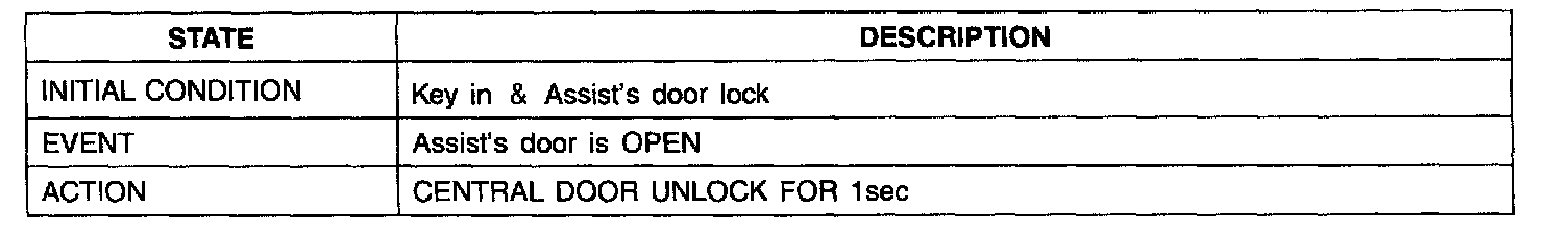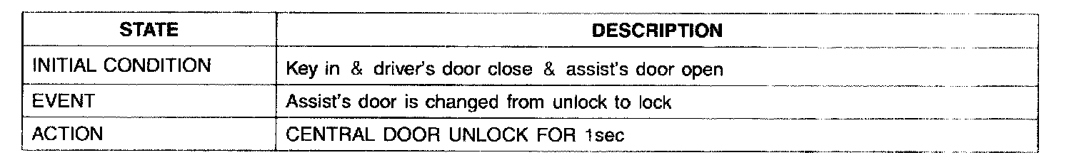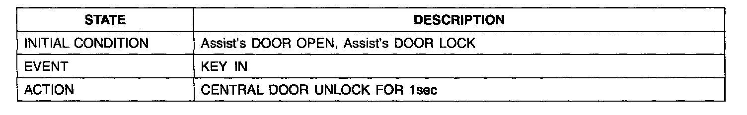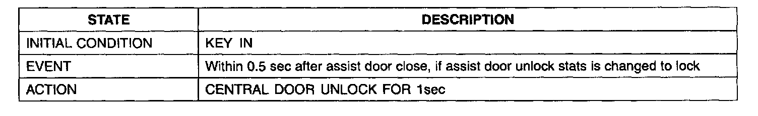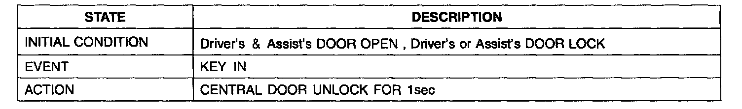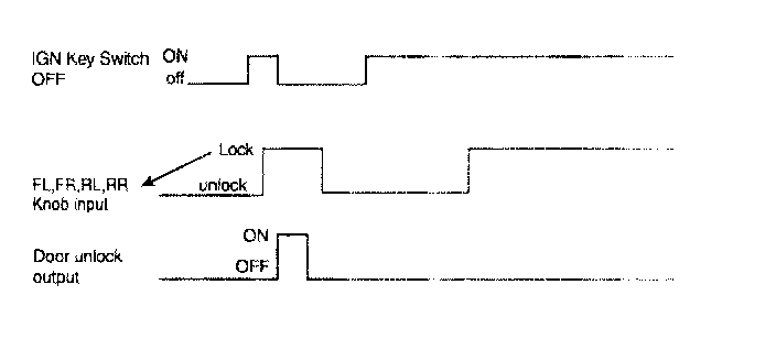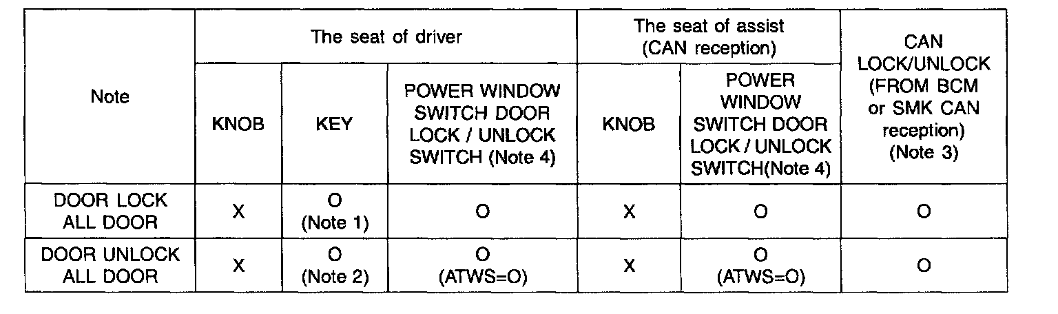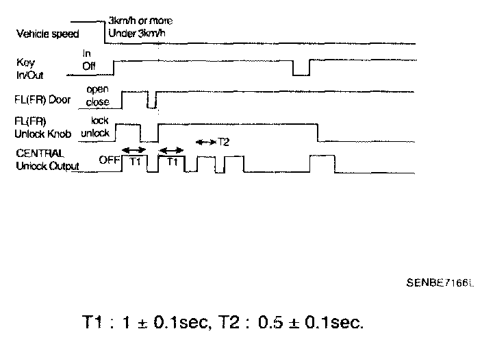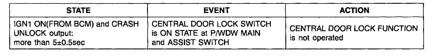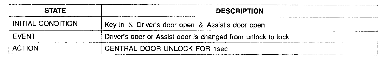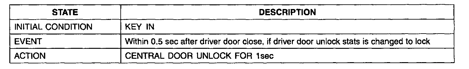 1. It output UNLOCK in case of driver's DOOR UNLOCK KNOB change to UNLOCK from LOCK in all DOOR CLOSE states (0.5 ± 0.1.sec). AUTO DOOR UNLOCK(connecting to driver's seat) input condition at AUTO DOOR UNLOCK (CONNECTING TO A SPEED LEVER) output is ignored.