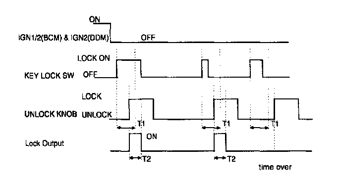 1. In case of KEY LOCK SWITCH becomes ON in OFF; driver seat UNLOCK KNOB is LOCK state or becomes LOCK in UNLOCK within 3 seconds and when IGN1 OFF ( FROM BCM ) & IGN2 OFF (FROM BCM) & is IGN2 OFF ( DDM itself ), achieve LOCK. (T1 : 3 S ± 500 mSs, T2 : 0.5 s ± 100 mSs)