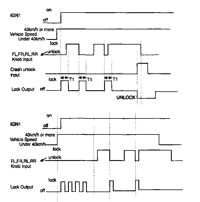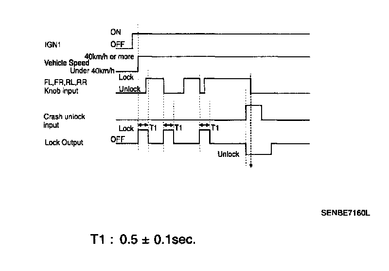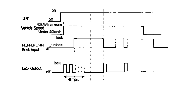 1. When the IGN1 is ON, if the vehicle speed is changed over 40 km/h from under (the signal shall be transferred to CAN from BCM), and if one door lock switch of the all door lock: switch (FL, FR, RL, and RR) is UNLOCK, then the LOCK signal shall be output. (0.5 ± 0.1 sec), If one door lock switch of the all door lock switch (FL, FR, RL, and RR) is UNLOCK after LOCK signal is output, the LOCK OUTPUT (ON for 0.5 ± 0.1 sec, OFF for 0.5 ± 0.1 sec) shall be output at most 3 times (totally 4 times).