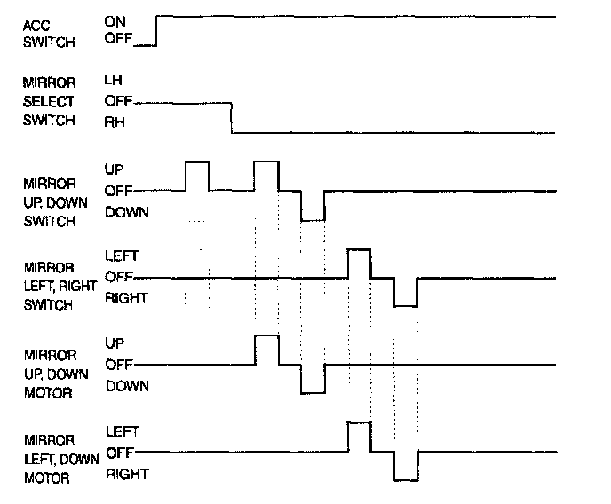- At the ACC ON state, if the mirror select switch in the SW ASSY P/WDW MAIN is the LH state and the mirror direction switches (UP, DOWN, LEFT, and RIGHT) are operated, then the mirror motor shall be drive to control the mirror to the desired direction.