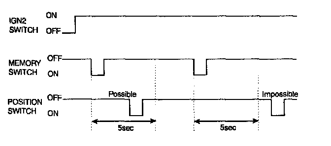1. If the position switch (POS1 or POS2. within 5 seconds after the memory switch is pushed at the ON state of the IGN2 (the switch module shall send the state signal through LIN), the present mirror position shall be memorized. (The 5-seconds duration from the ON state of the memory switch is the memory allowance period so that the allowance state shall be released if the 5 seconds duration is passed. That is, if the position switch (POS1 or POS2. is ON during the memory allowance period, then the present position shall be memorized.) Except, when the mirror manual switch at the LH is operated, the mirror position at RH shall not be memorized.