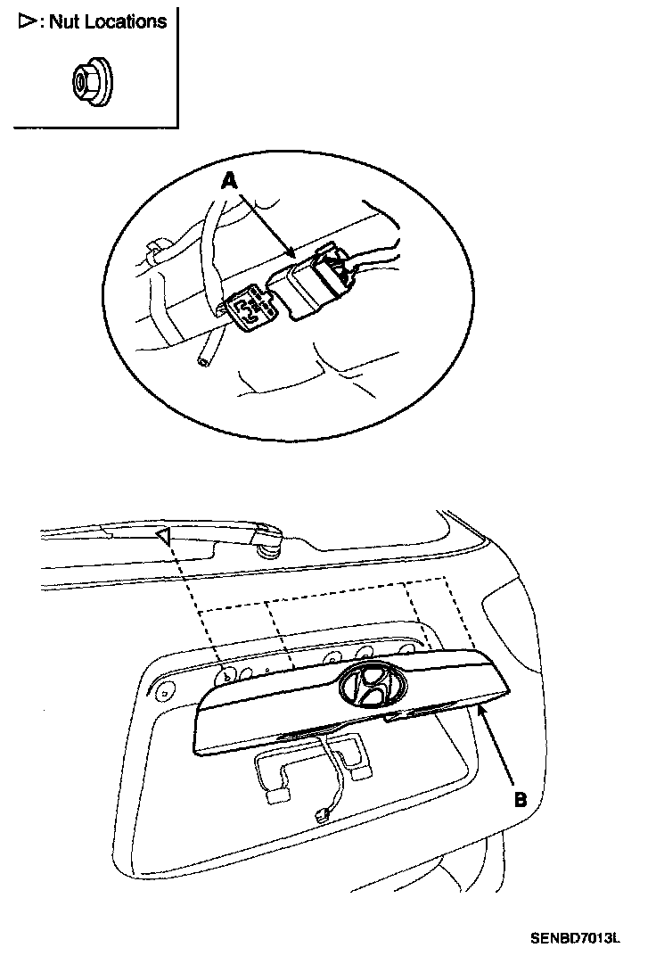 2. After disconnecting the connector (A), remove the power window motor (B).
