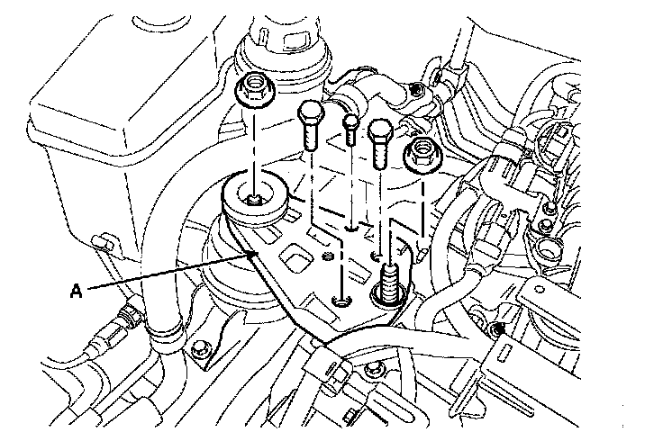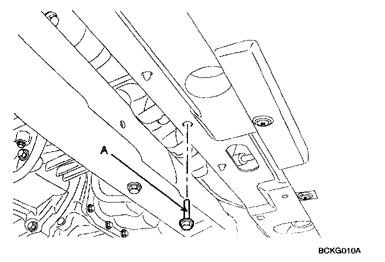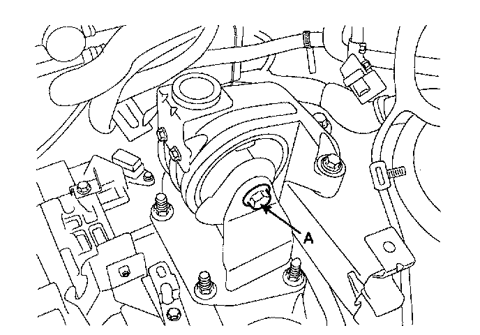 27. Remove the transaxle insulator mounting bolt(A).