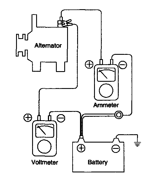 1. Check to see that the voltmeter reads as the same value as the battery voltage. If the voltmeter reads 0 V, and the open circuit in the wire between alternator "B" terminal and battery (-) terminal or poor grounding is suspected.