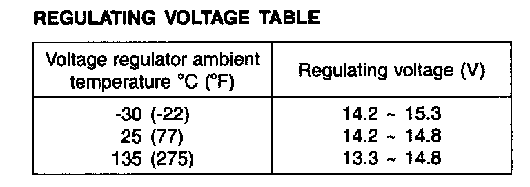 1. If the voltmeter reading agrees with the value listed in the regulating voltage table, the voltage regulator is functioning correctly. If the reading is other than the standard value, the voltage regulator or the alternator is faulty.