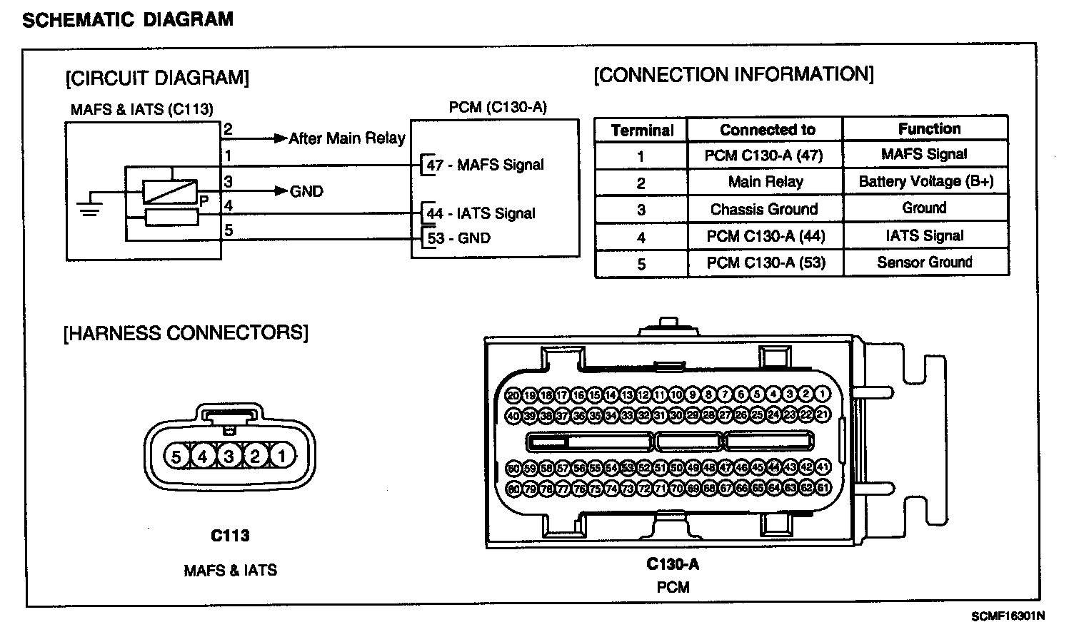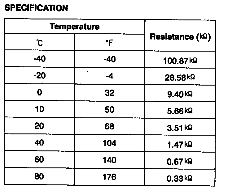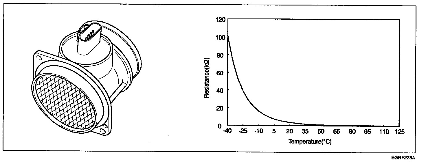 Intake Air Temperature Sensor (IATS) is installed inside the Mass Air Flow Sensor (MAFS) and detects the intake air temperature. To calculate precise air quantity, correction of the air temperature is needed because air density varies according to the temperature. So the PCM uses not only MAFS signal but also IATS signal. This sensor has a Negative Temperature Coefficient (NTC) and its resistance is in inverse proportion to the temperature.
