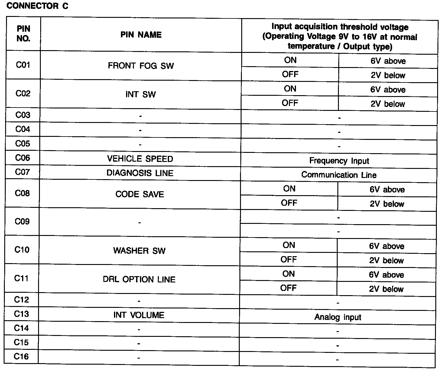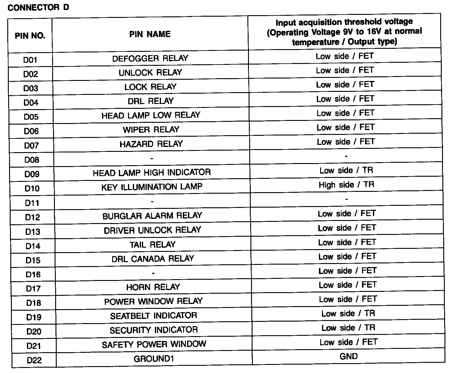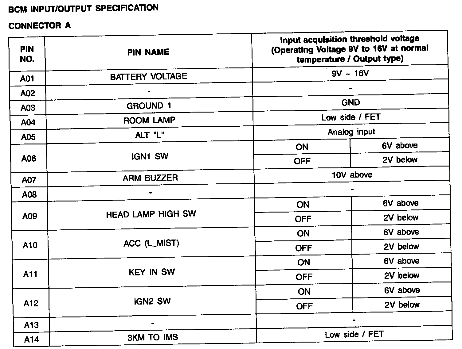 BCM Input/output Specification - Connector A: