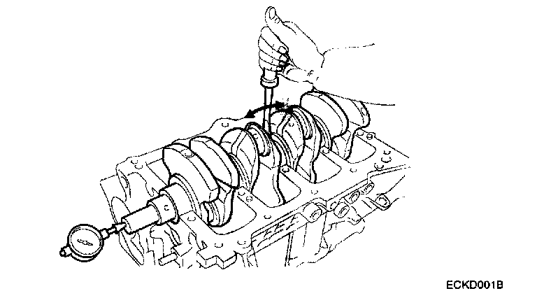 Using a dial indicator, measure the thrust clearance while prying the crankshaft back and forth with a screwdriver.