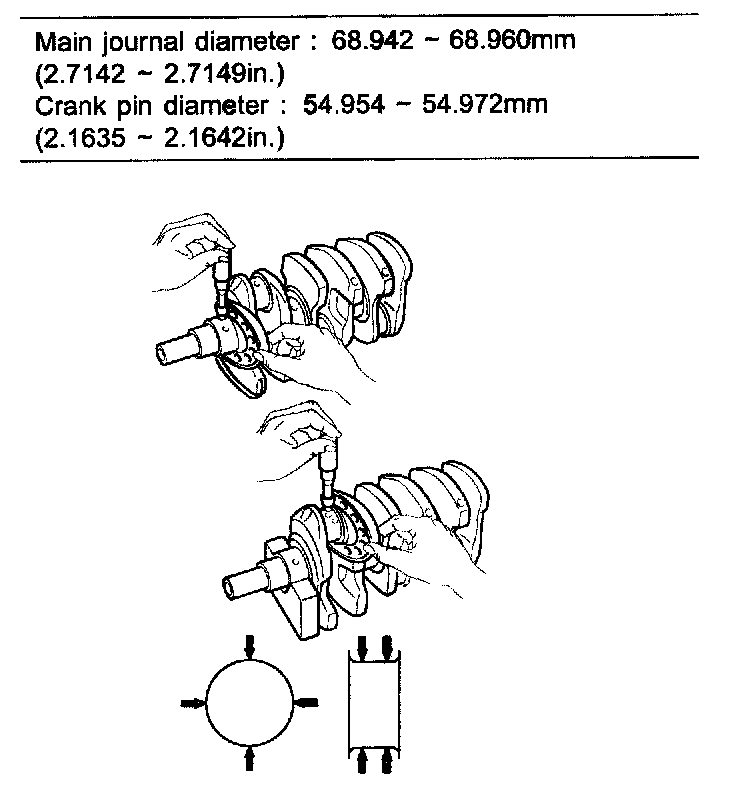 Using a micrometer, measure the diameter of each main journal and crank pin.