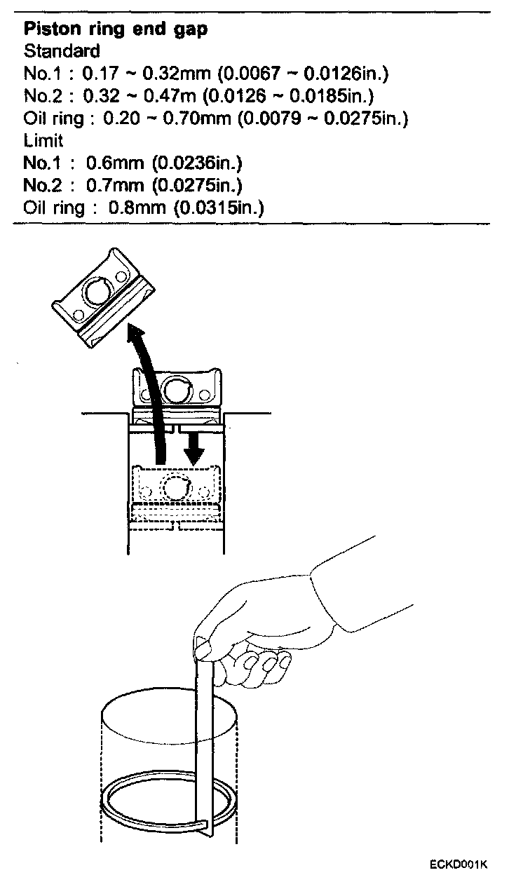 To measure the piston ring end gap, insert a piston ring into the cylinder bore. Position the ring at right angles to the cylinder wall by gently pressing it down with a piston. Measure the gap with a feeler gauge. If the gap exceeds the service limit, replace the piston ring. If the gap is too large, recheck the cylinder bore diameter against the wear limits. If the bore is over the service limit, the cylinder block must be replaced.