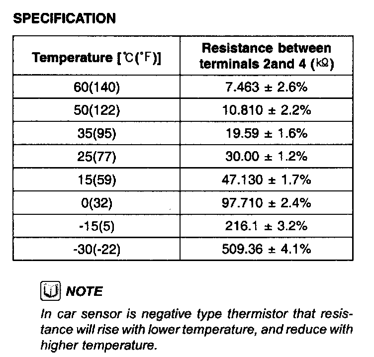 Blow air with changing temperature to the in-car sensor air inlet. Measure sensor resistance between 2 and 4 terminals.