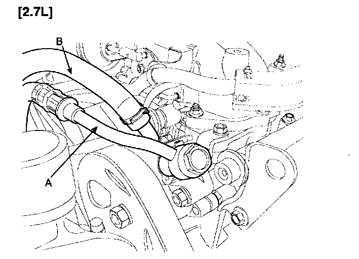 2. Disconnect the pressure tube (A) and suction hose (B) from the power steering oil pump.