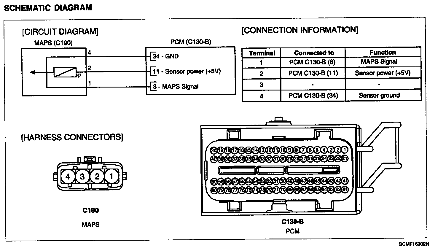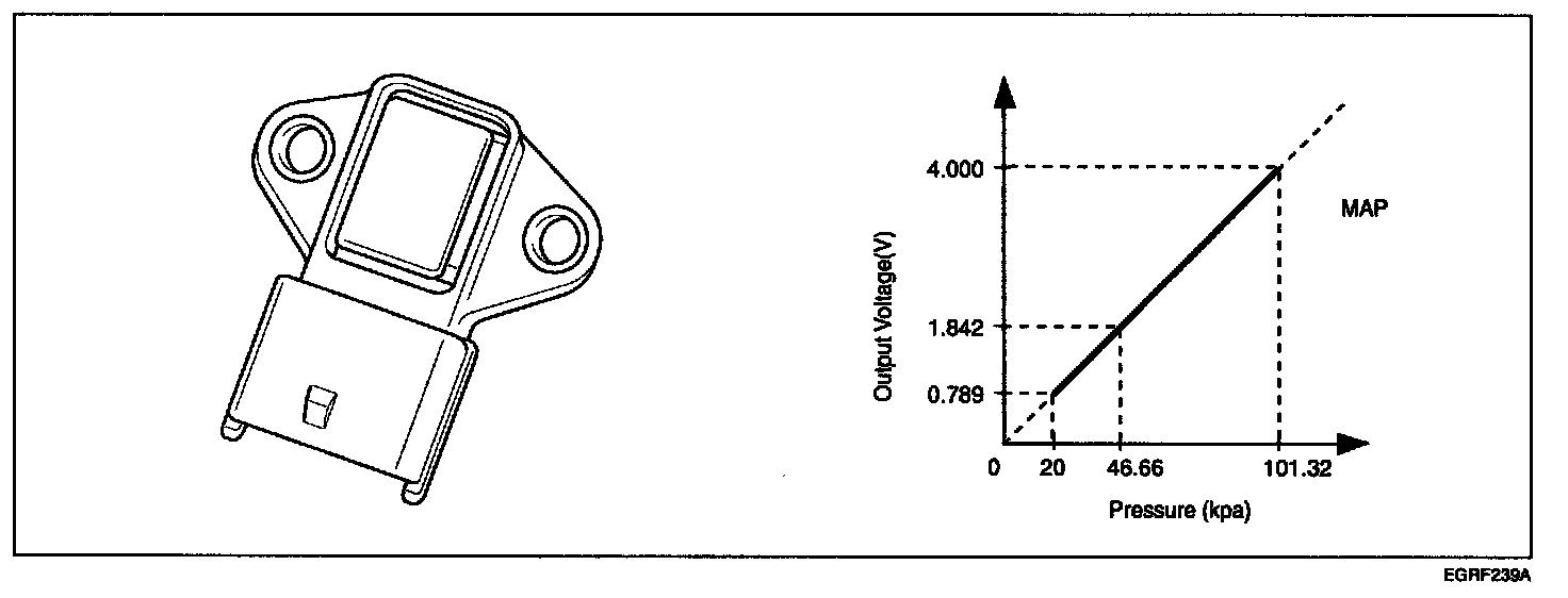 Manifold Absolute Pressure Sensor (MAPS) is speed-density type sensor and is installed on the surge tank. This MAPS senses absolute pressure in surge tank and transfers this analog signal proportional to the pressure to the PCM. The PCM calculates the intake air quantity and engine speed based on this signal. This MAPS consists of piezo-electric element and hybrid IC that amplifies the element output signal. The element is silicon diaphragm type and adapts pressure sensitive variable resistor effect of semi-conductor. 100% vacuum and the manifold pressure applies to both sides of it respectively. That is, this sensor outputs the silicon variation proportional to pressure change by voltage.
