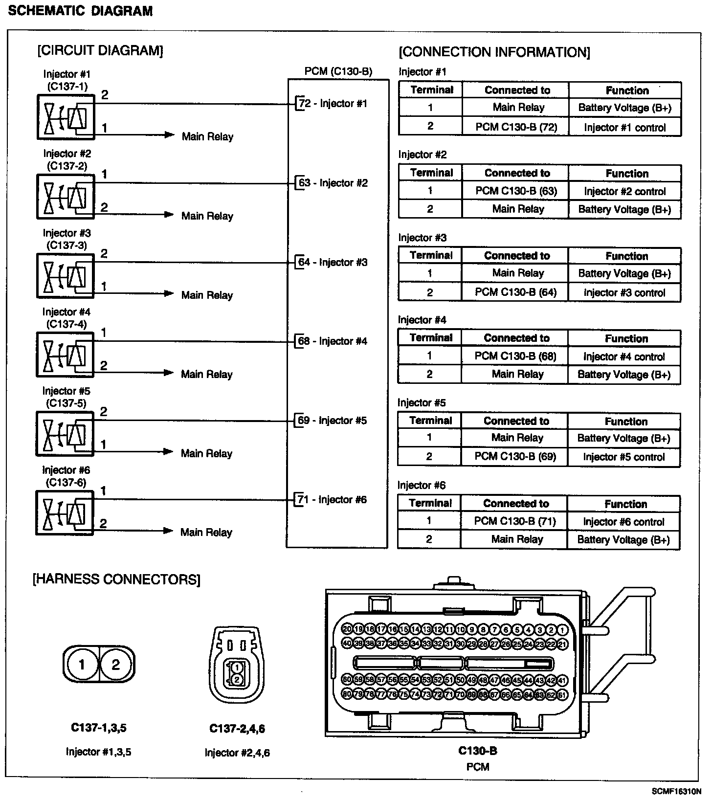 Based on information from various sensors, the PCM measures the fuel injection amount. The fuel injector is a solenoid- operated valve and the fuel injection amount is controlled by length of time that the fuel injector is held open. The PCM controls each injector by grounding the control circuit. When the PCM energizes the injector by grounding the control circuit, the circuit voltage should be low (theoretically 0 V) and the fuel is injected. When the PCM de-energizes the injector by opening control circuit, the fuel injector is closed and circuit voltage should momentarily peak.