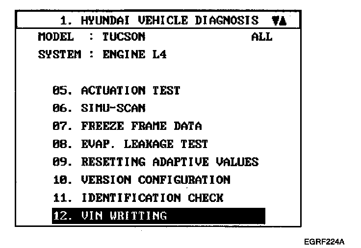 VIN PROGRAMMING PROCEDUREVIN (Vehicle Identification Number) is a number that has the vehicle's information (Maker, Vehicle Type, Vehicle Line/Series, Body Type, Engine Type, Transmission Type, Model Year, Plant Location and so forth. For more information, please refer to the group "GI" in this SERVICE MANUAL). When replacing an ECM, the VIN must be programmed in the ECM. If there is no VIN in ECM memory, the fault code (DTC P0630) is set.