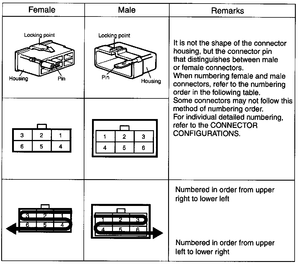 - It shows the front of the connector on the harness side when not to the harness connector. The terminal number on each connector can be obtained by following the pattern used in (5) connector view and numbering order. Unused terminals are marked with an asterisk (*).