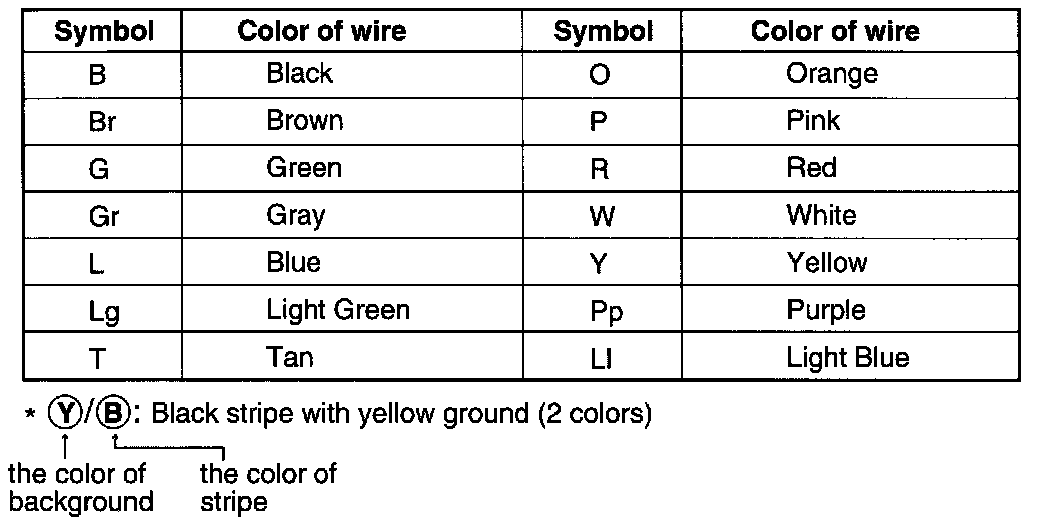 The following abbreviations are used to identify wire colors in the circuit schematics.