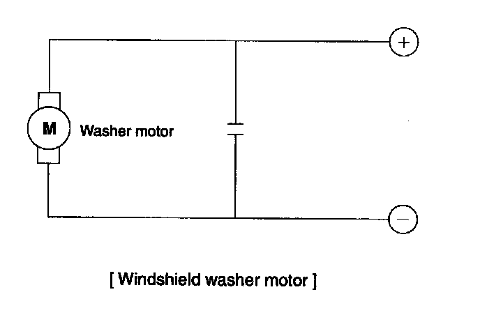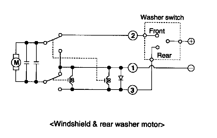 2. Connect positive (+) and negative (-) battery cables to terminals 2 and 1 respectively to see that the washer motor runs and water sprays from the front nozzles.