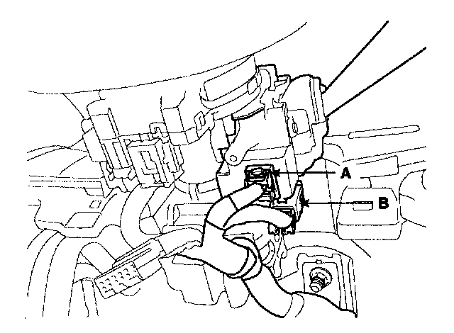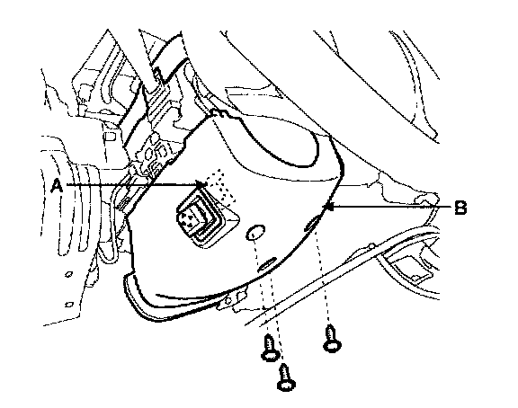 2. Remove the steering column upper and lower shrouds (B) after removing 3 screws and connector (A).