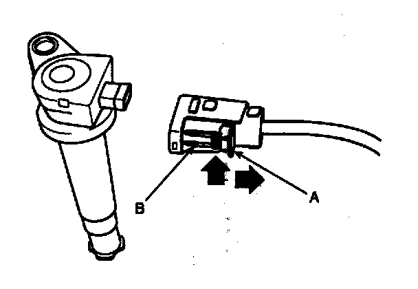 NOTE: When removing the ignition coil connector, pull the lock pin (A) and push the clip (B).