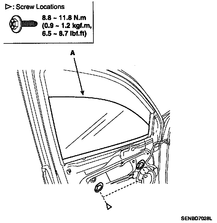 3. Carefully move the glass (A) until you can see the bolts, then loosen them. Separate the glass from the glass run and carefully pull the glass out through the window slot.