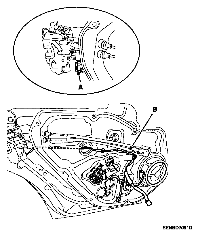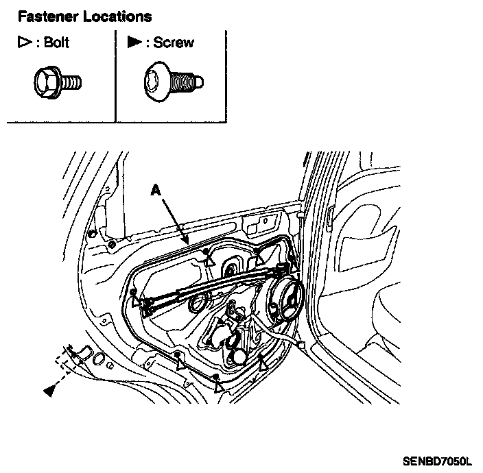3. After loosening the door module mounting bolts and screws, then remove the door module (A).