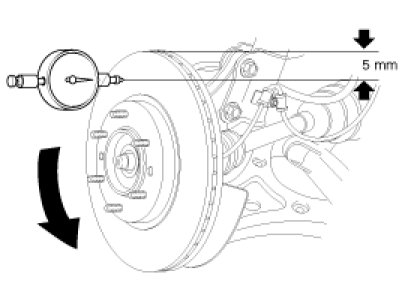 1. Place a dial gauge about 5mm (0.2 in.) from the outer circumference of the brake disc, and measure the run out of the disc.