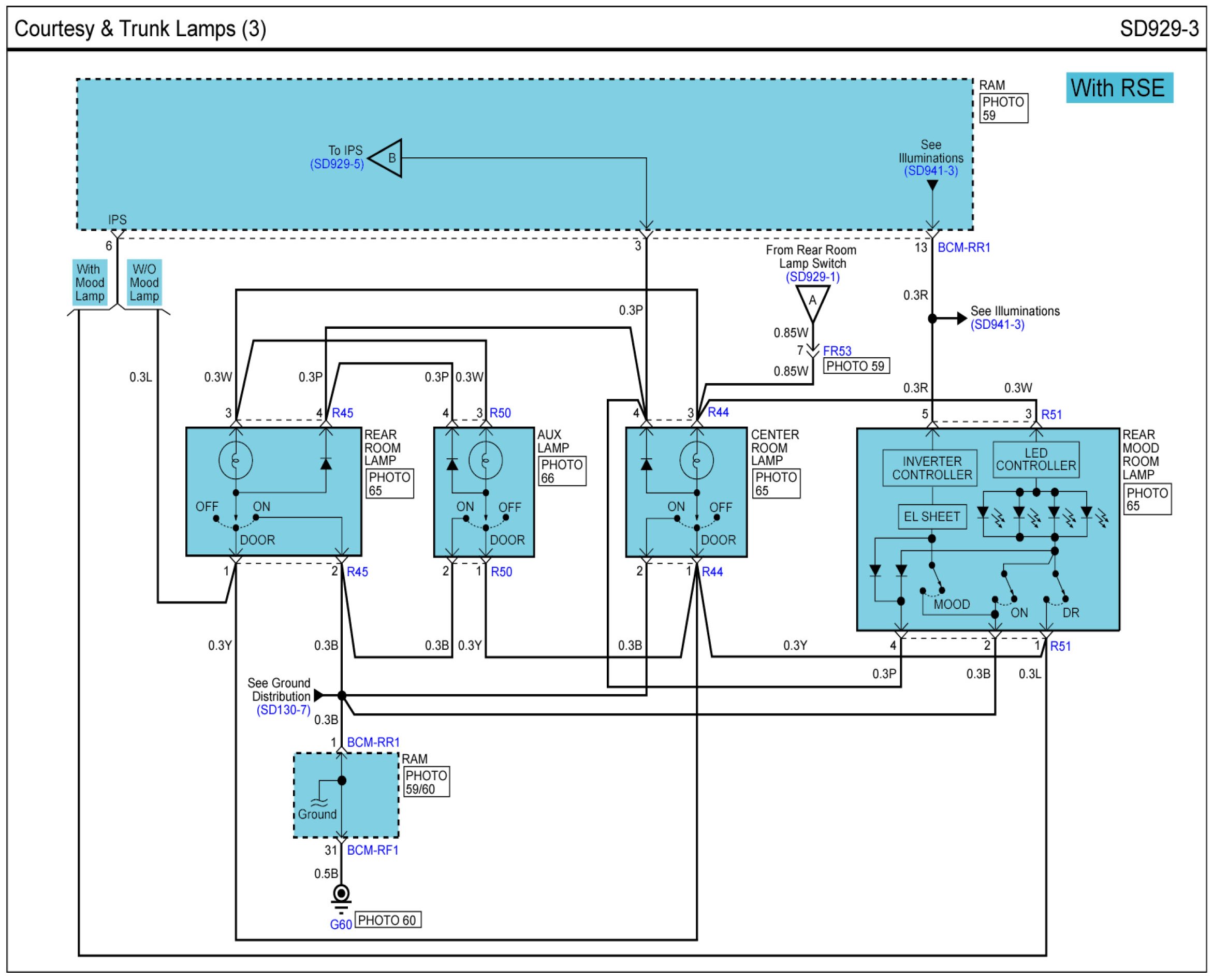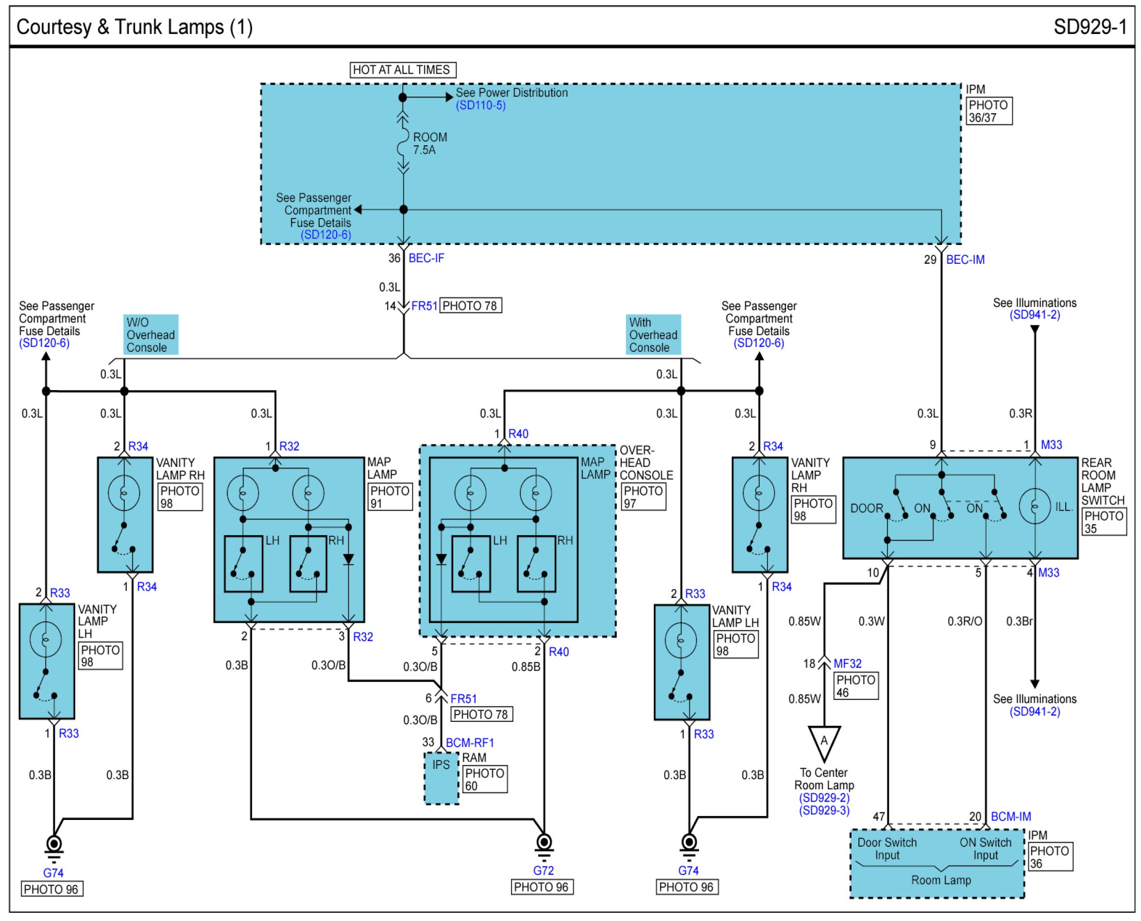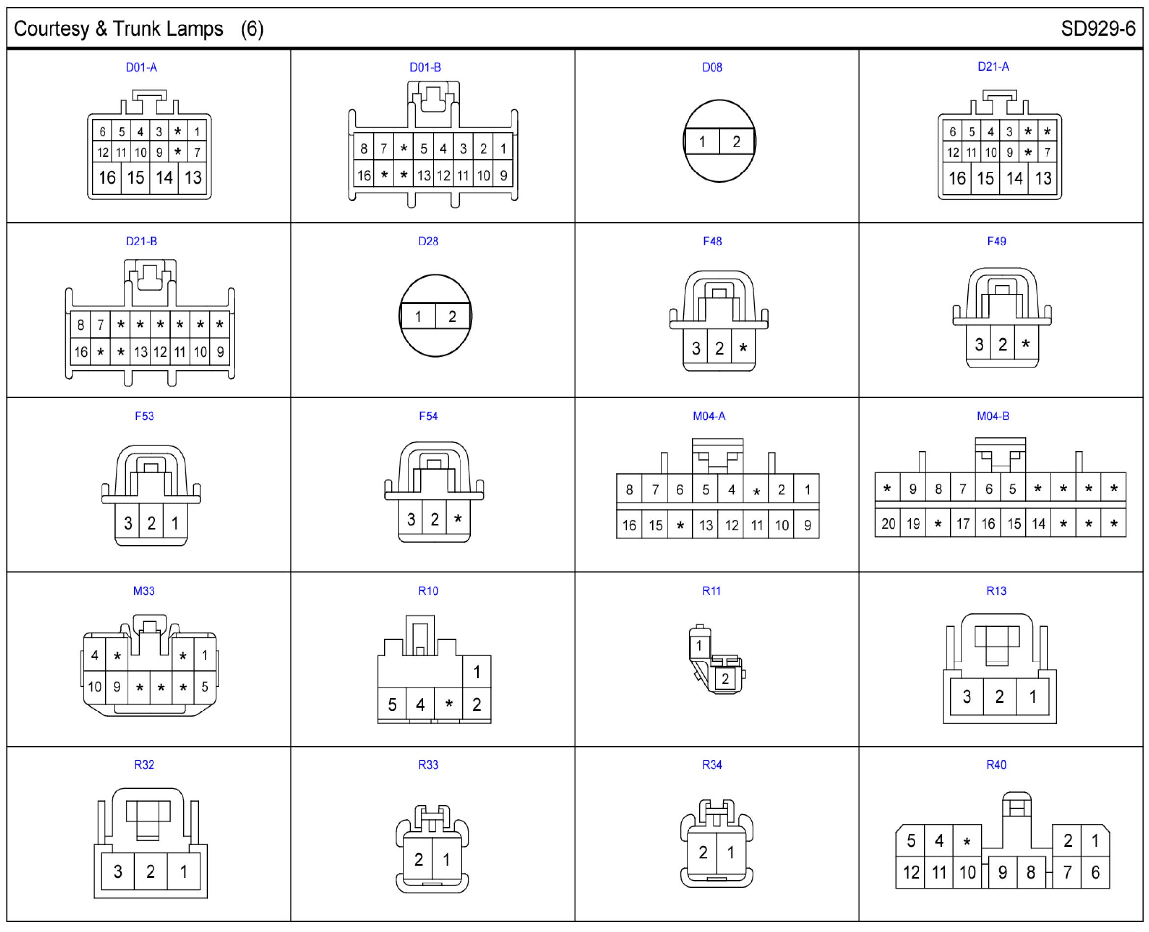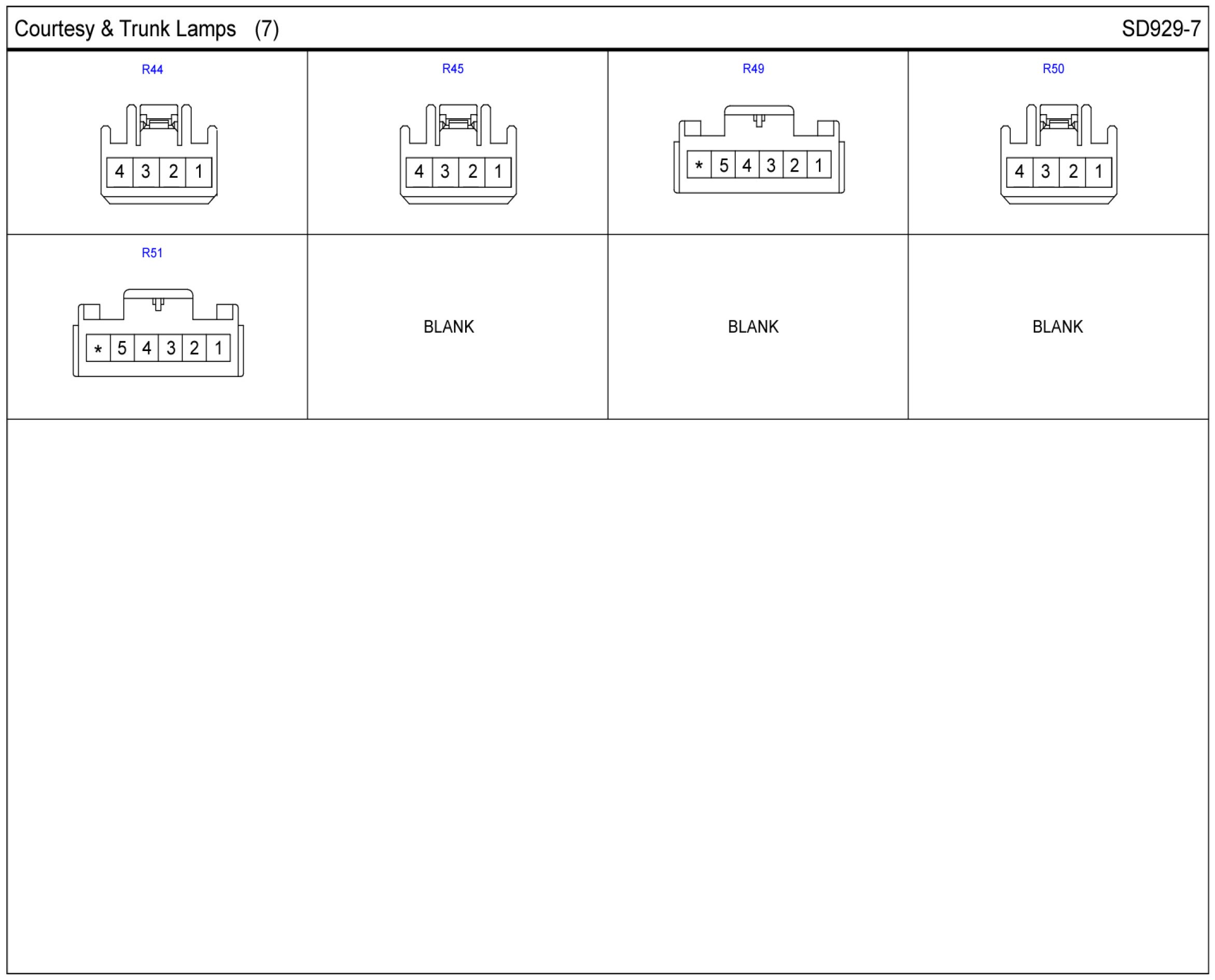 Courtesy & Trunk Lamps Connector Pin Outs: