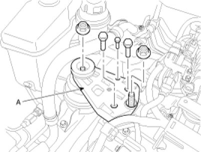 26. Supporting the engine and transaxle assembly with sub frame, remove the engine mounting bracket(A).
