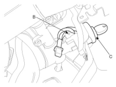 6. Remove the key lock cylinder (C) after pushing lock pin (B) with key ACC.