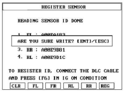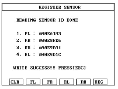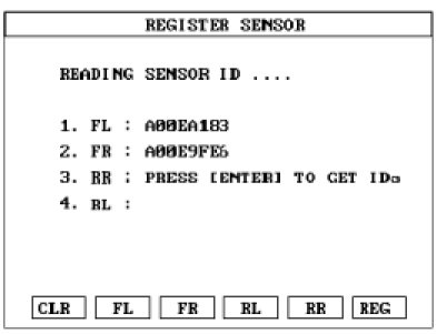 1. Read the four sensor's ids starting with sensor 1 (1 normally front left, 2 front right, 3 rear left, 4 rear right).