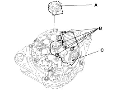 3. Loosen the mounting bolts(B) and disconnect the brush holder assembly(C).