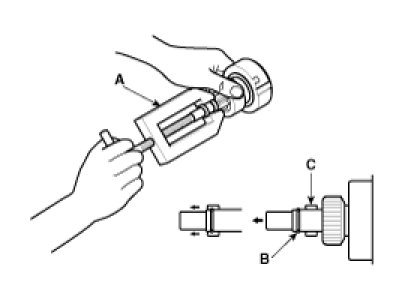 Using a suitable pulling tool (A), pull the overrunning clutch stop ring (B) over the stopper (C).