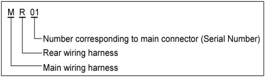 A Connector identification symbol consists of a wiring harness location classification symbol corresponding to a wiring harness location and number corresponding to the connector.