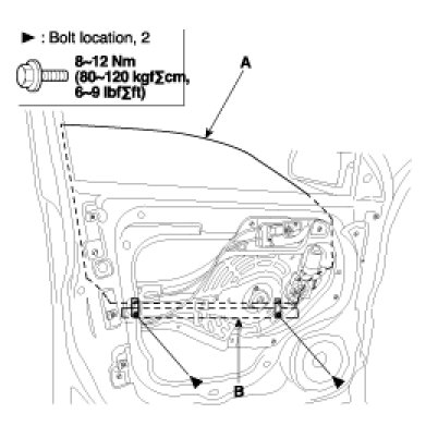 2. Carefully move the glass (A) until you can see the bolts, then loosen them. Separate the glass from the glass run and carefully pull the glass out through the window slot (B).