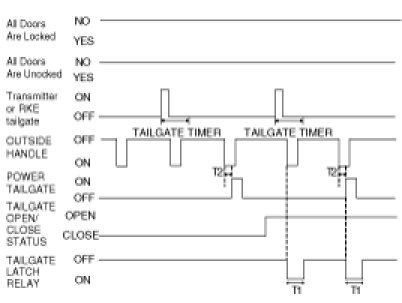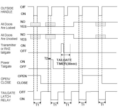 This input signal controls TAILGATE LATCH RELAY under the only condition that is TAILGATE closed. Door lock / unlock status doesn't factor to operate TAILGATE LATCH RELAY by TAILGATE. There is no TAILGATE TIMER (30 sec.) running for this input. Other case, this signal doesn't control the TAILGATE LATCH RELAY.