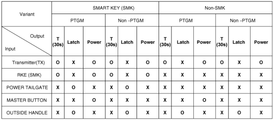 Regardless of all door lock / unlock status, TAILGATE TIMER (30 sec.) begins with the input of RKE TAILGATE.